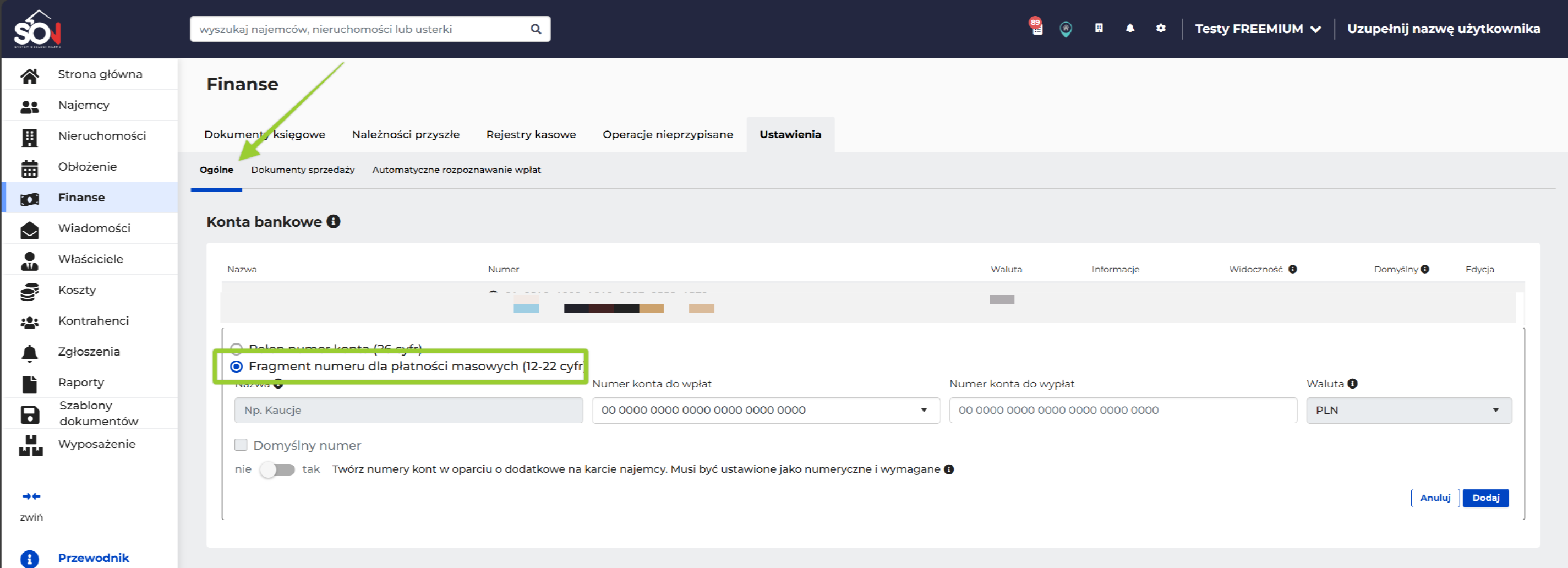 Pamiętaj, żeby w Finanse → Ustawienia wpisać fragment numeru konta, na podstawie którego wygenerują się rachunki wirtualne dla najemców.