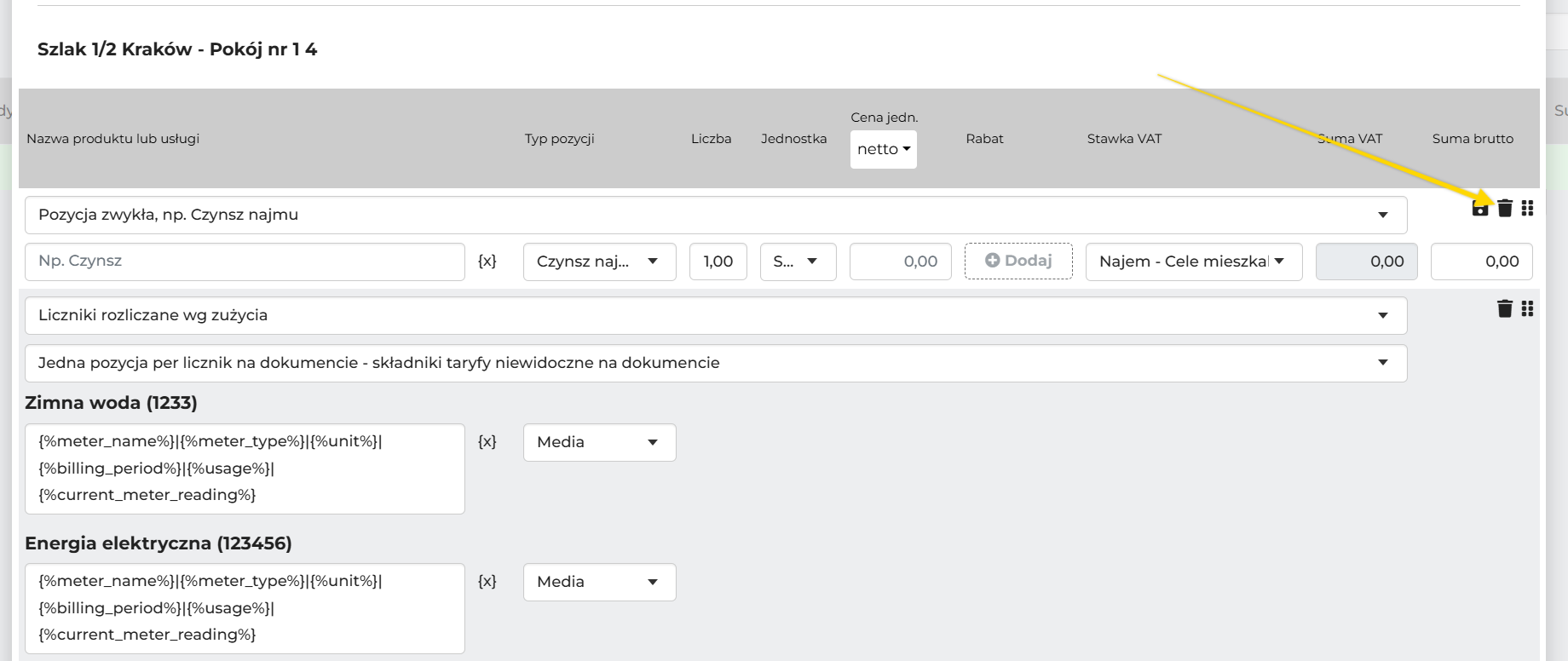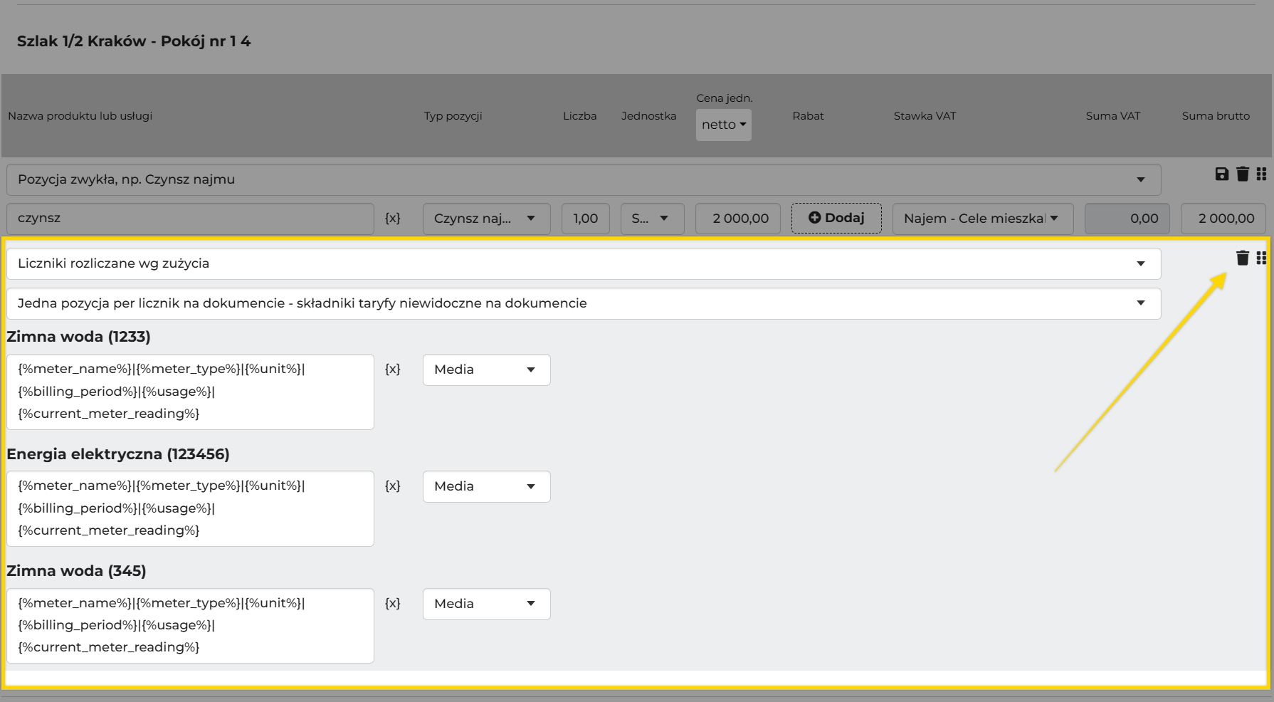 Pozycje licznikowe zawsze dodają się jako kolejna pozycja zwykła na dokumencie. Jeśli chcesz, aby liczniki wystawiały się jako "ponadto do zapłaty" (dotyczy faktur) lub na oddzielnym dokumencie (fakturze lub naliczeniu), należy stworzyć oddzielne należności.