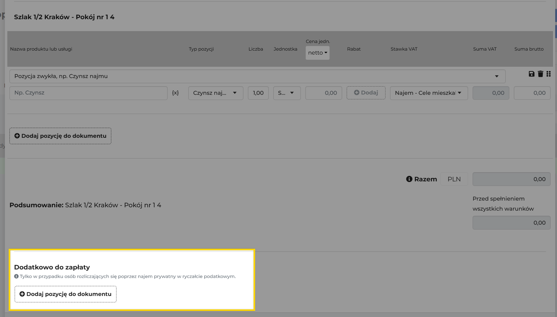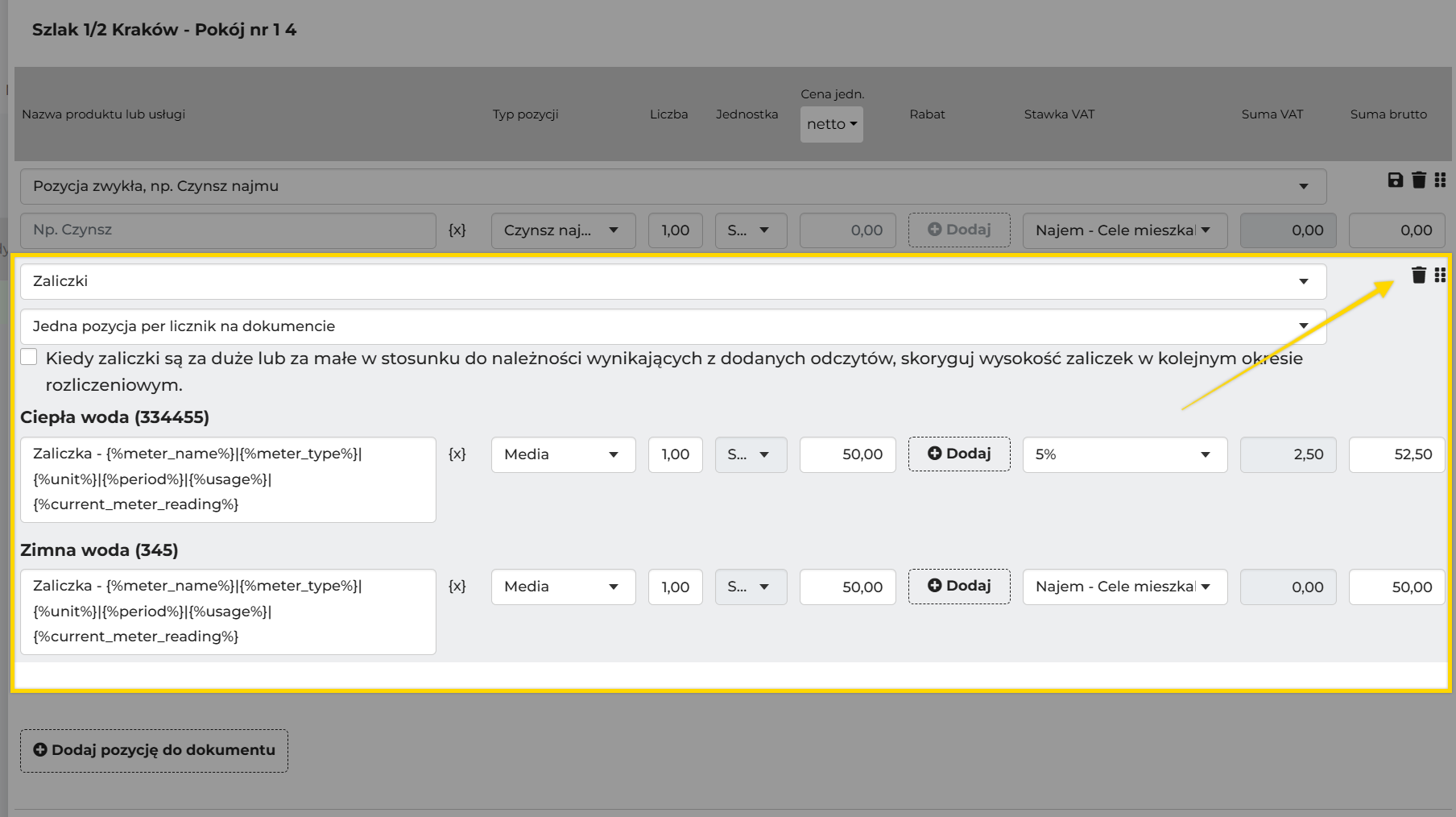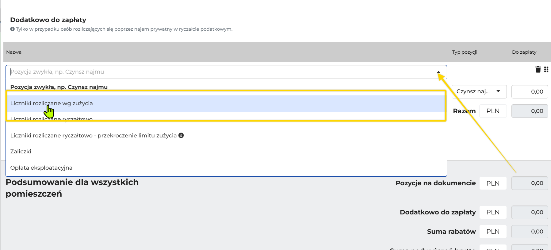Dodać pozycje licznikowe w polu "Dodatkowo do zapłaty"