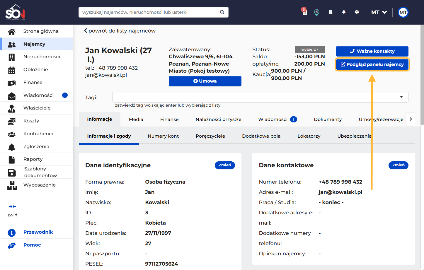 Jest to istotny krok, ponieważ adres e-mail wpisany na karcie najemcy/właściciela w sekcji Dane kontaktowe służy do identyfikacji danej osoby i weryfikacji, jakie dane powinny zostać przedstawione w panelu.