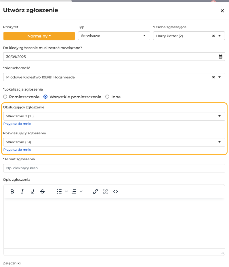 - Obsługujący zgłoszenie - to osoba, która koordynuje sprawę, przyjmuje zgłoszenie, monitoruje jego przebieg i dba o kontakt z najemcą lub innymi stronami. Może delegować zadania, zbierać potrzebne informacje i pilnować terminów.