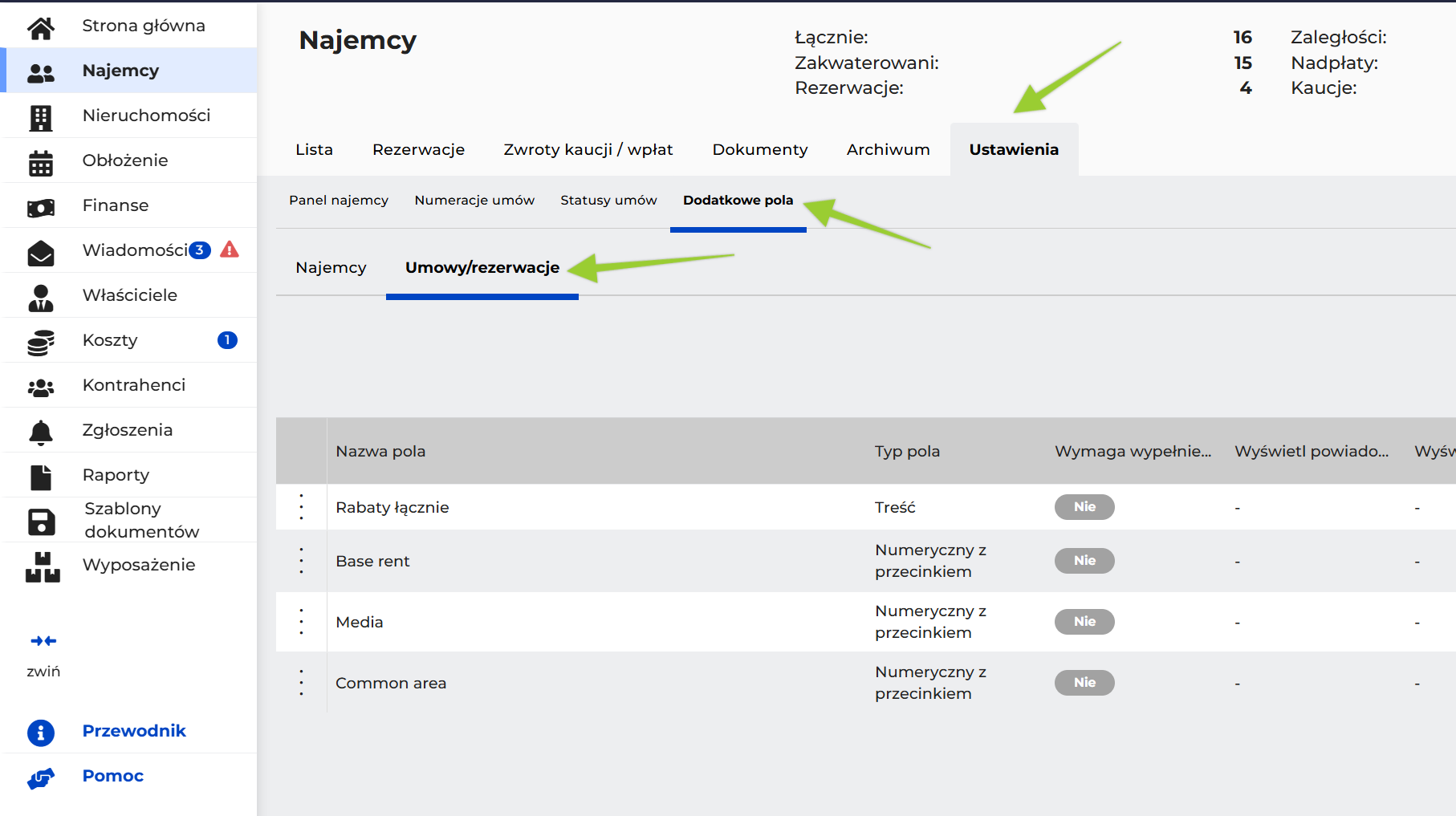 - Użyć pól dodatkowych i dodać je na najemcy: Pola dodatkowe