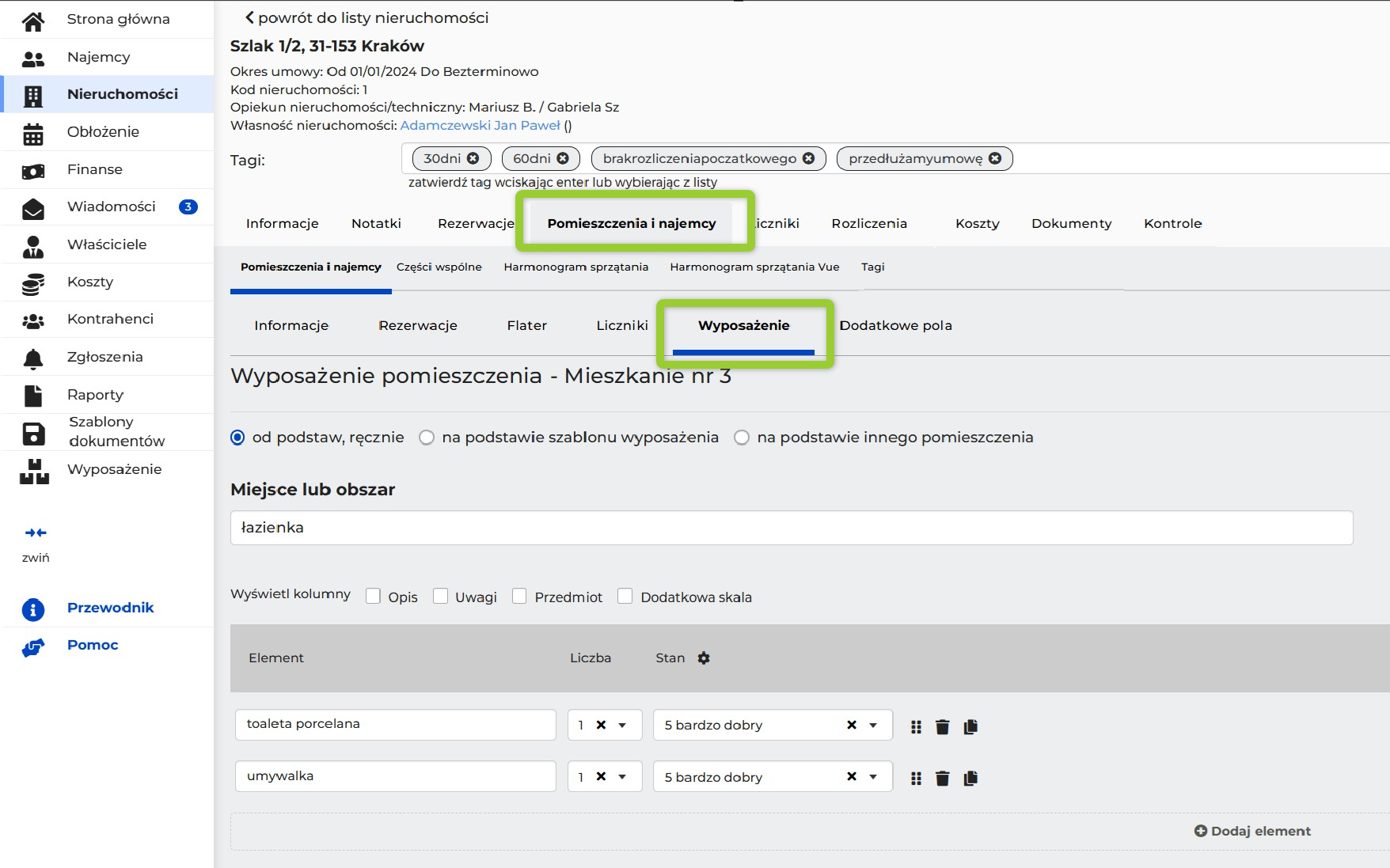 Wyposażenie dodaje się z poziomu pomieszczenia i/lub nieruchomości (jeśli pomieszczenia mają dodatkowo części wspólne, które są ujmowane na protokołach np. przy wynajmie na pokoje).