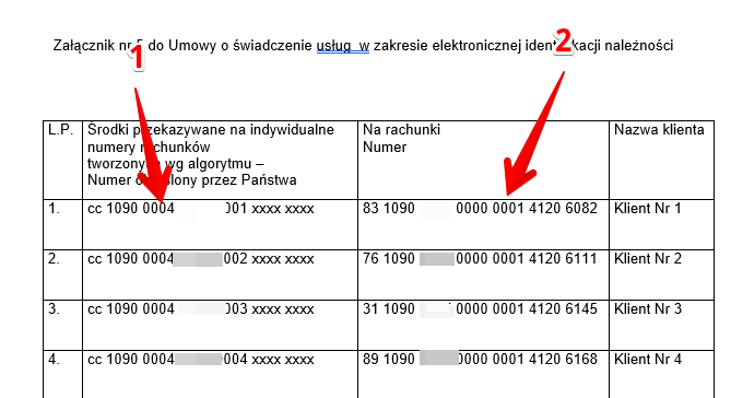 - bardziej rozbudowana metoda, gdzie dla każdego właściciela tworzone jest osobne subkonto w Twoim banku i do każdego z nich podpięte są płatności masowe. Dzięki temu wpływy od najemców poszczególnych właścicieli nie mieszają się miedzy sobą, a jednocześnie zachowujesz możliwość używania płatności masowych. Aby skorzystać z tej opcji, musisz podpisać osobną umowę z bankiem. Z tego, co wiem, to obecnie taką usługę posiadają 2 banki: ING oraz Santander. Jest to usługa, z której korzystają np. spółdzielnie, czy wspólnoty. Po podpisaniu umowy otrzymasz informację, który fragment numeru konta jest przypisany do danego konta głównego. Tak powinien wyglądać załącznik do umowy: