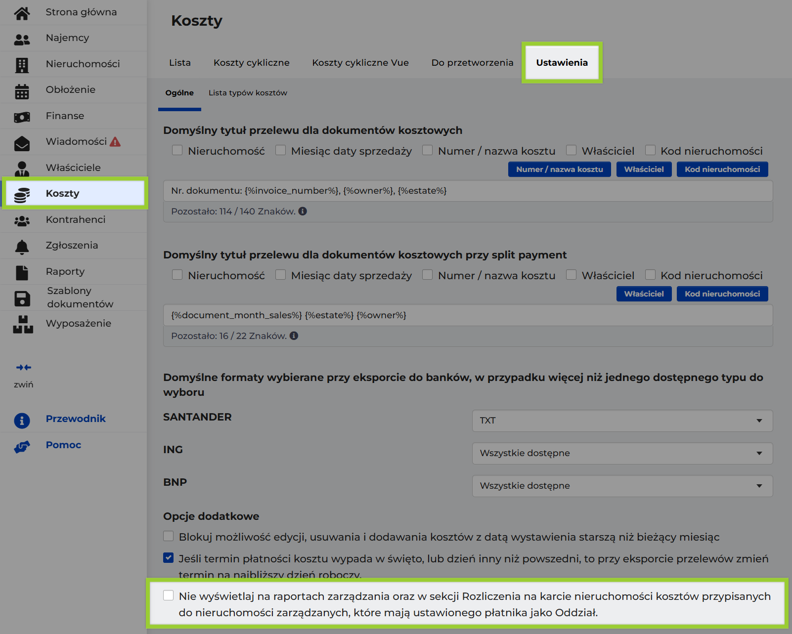 koszt przypisany do nieruchomości zarządzanej, ale z płatnością oznaczoną "po naszej stronie" lub "do ustalenia", a nie "po stronie właściciela". Taki koszt domyślnie pojawia się w sekcji rozliczenia. Można wyłączyć jego widoczność w menu Koszty: