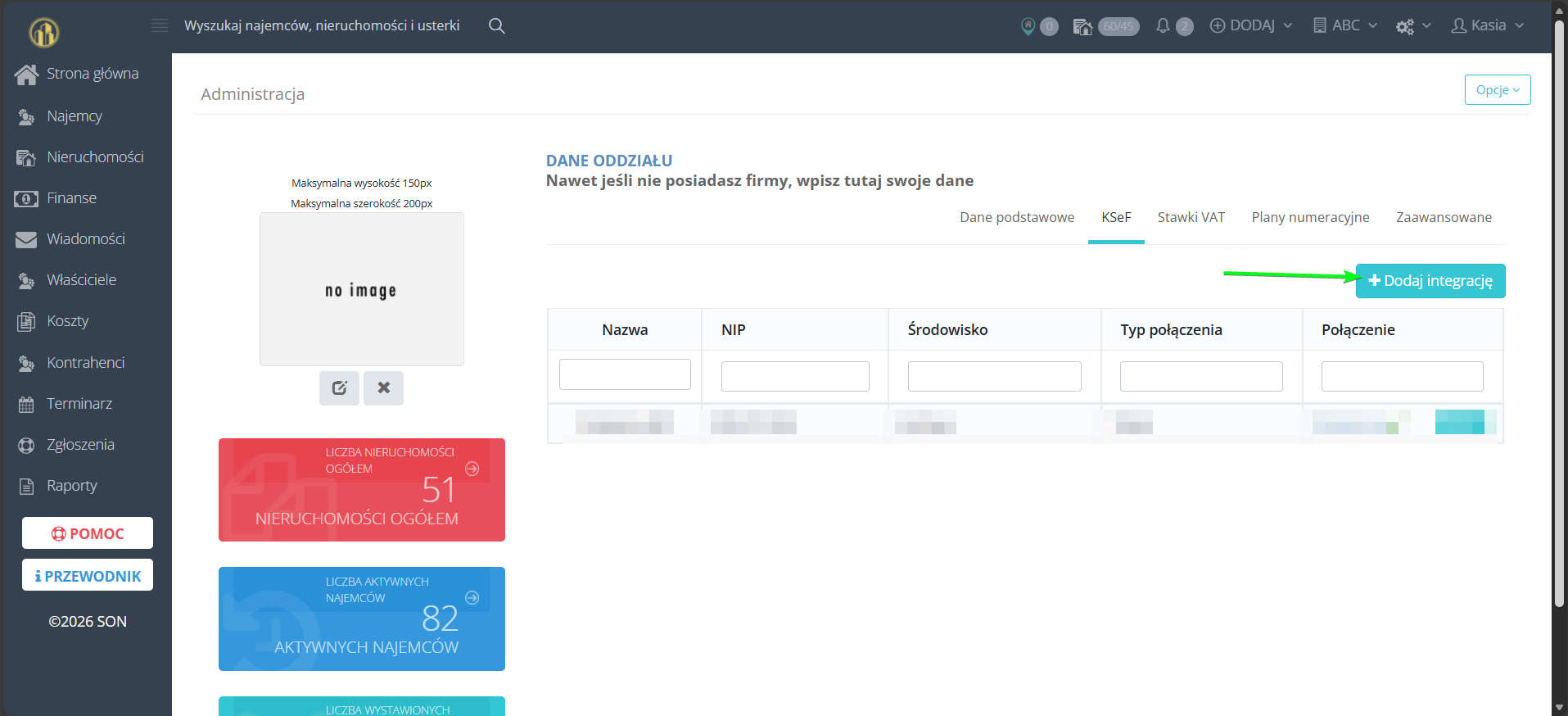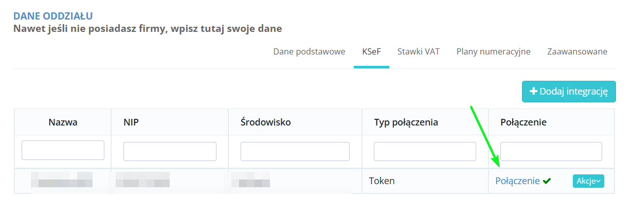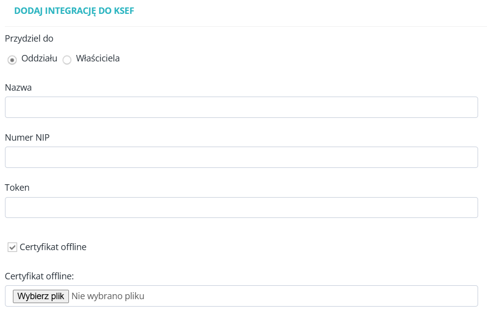 Przejdź do ustawień oddziału, do sekcji KSeF i wybierz "Dodaj integrację":