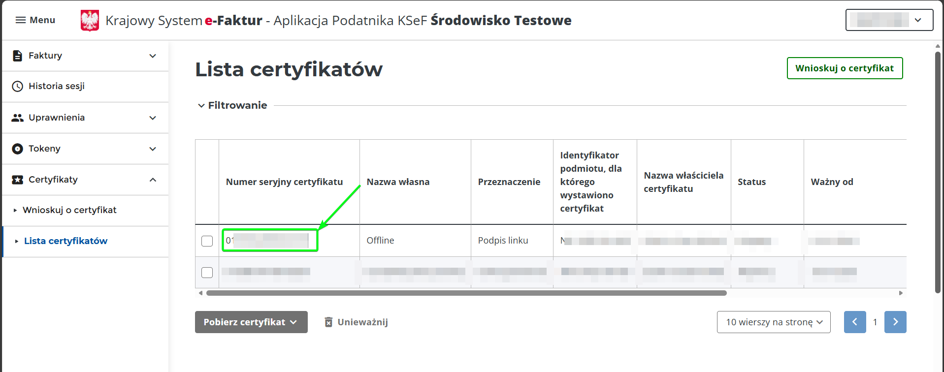 - Numery seryjny certyfikatu uwierzytelniającego do Trybu Offline (opcjonalnie)