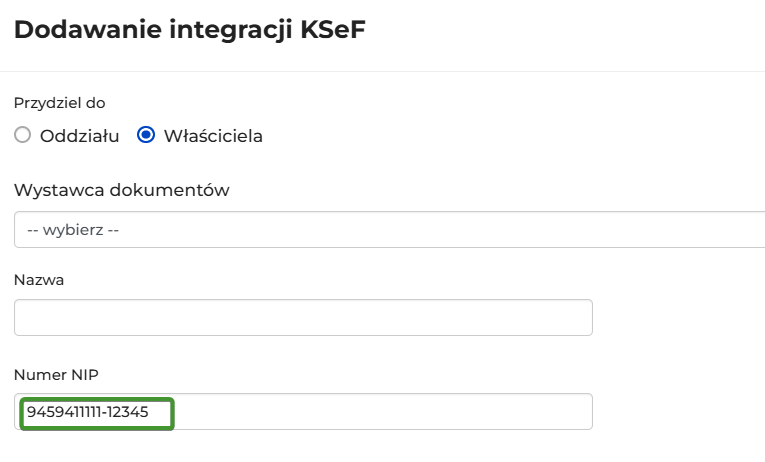 Podczas dodawania integracji KSeF w SON, w polu, w którym standardowo wpisuje się NIP, należy wpisać pełny identyfikator wewnętrzny (NIP + myślnik + cyfry), a nie sam NIP właściciela.